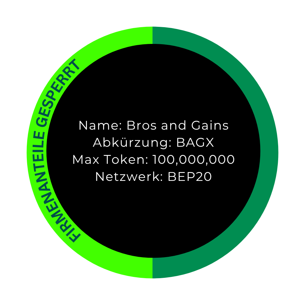 Unsere Investmentgesellschaften halten 50 % aller BAGX-Token und damit zugleich 50 % der gesamten Bros & Gains-Struktur. Diese BAGX-Token sind gesperrt und nicht für den Handel bestimmt. Sie dienen ausschließlich der Stabilität und Absicherung unserer Unternehmensstruktur. Beteiligungen an unseren Gesellschaften erfolgen ausschließlich auf privater, vertraglich geregelter Basis und stehen ausgewählten Investoren offen. Ein öffentliches Angebot ist ausgeschlossen.