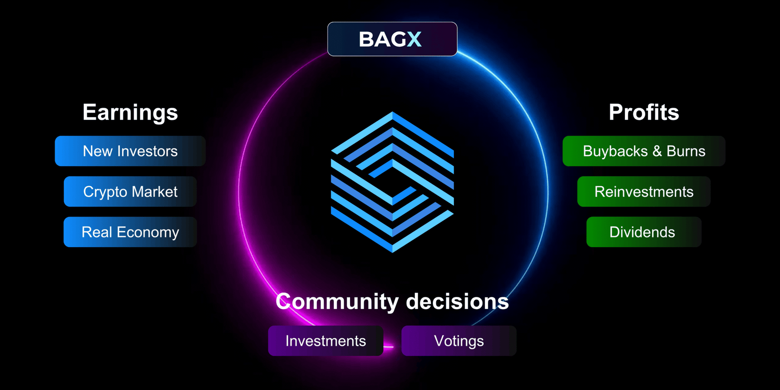 Investors can view BAGX shares as their gateway into the ecosystem: holders gain exposure to the overall performance of the platform, participate in profit distributions, and benefit from long-term value appreciation. In addition, BAGX shareholders are aligned with the project’s success through governance participation, enabling a degree of influence over key strategic decisions.