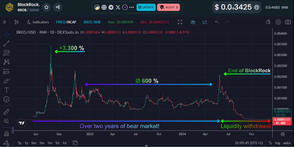 Within our previous project, BlockRock, we were able to achieve attractive returns even under considerably more challenging market conditions. At the peak performance phase, investors were able to increase their invested capital by up to 30x. On average, investors and members achieved a return of approximately 600% on their initial investment.